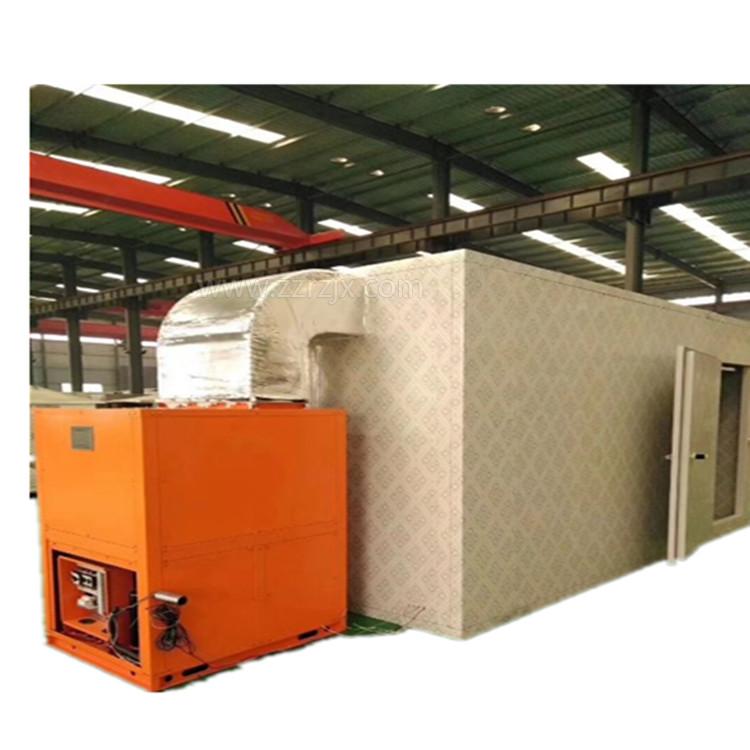 空氣能烘干房屬于高溫?zé)岜脵C(jī)組,其工作其工作原理是:利用冷媒經(jīng)過(guò)壓縮機(jī)壓縮,成為高溫高壓氣體,進(jìn)入冷凝器,冷凝液化放熱,用于烘干房空氣加熱,從而提高烘干房溫度。通過(guò)熱風(fēng)的形式使物料中的水分氣化蒸發(fā),蒸發(fā)出來(lái)的水蒸氣由排濕系統(tǒng)排走而達(dá)到烘干物料排濕的目的。排濕系統(tǒng)采用熱回收裝置,回收的熱量用于加熱新風(fēng),可節(jié)約60%-70%的新風(fēng)預(yù)熱能耗,從而達(dá)到了進(jìn)一步節(jié)能的效果。